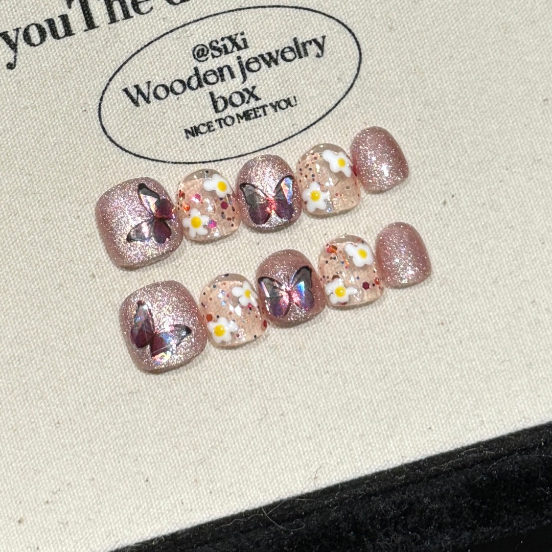 This children's handmade press-on nail set showcases an exquisite sweet pastoral style, perfectly suited for spring and summer seasons. The nail pieces are dominated by pink tones, accentuated with delicate glitter that creates a dreamy, gentle ambiance. Some nails are embellished with three-dimensional butterflies and daisies, adding natural and romantic elements. The gradient hues of the butterflies contrast beautifully with the fresh yellow-and-white floral accents, making the overall design vibrant and whimsically charming.