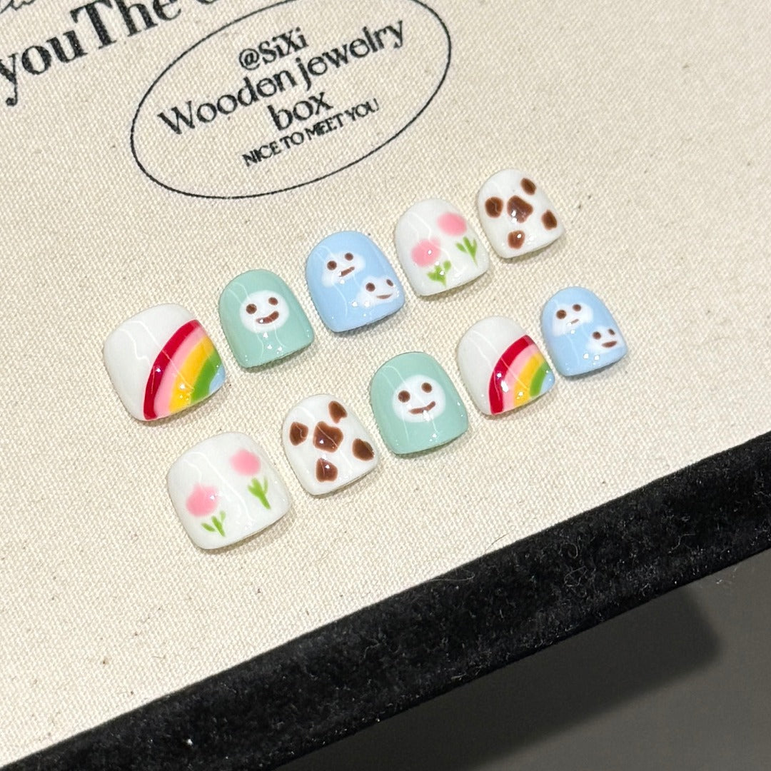 This set of handmade press-on nails for children showcases a playful and whimsical style, appealing to those who love fresh and lively elements. Featuring an oval-shaped design, the nails maintain a versatile and elegant look suitable for daily wear. The color palette centers around soft pastel blue and white, accented with cheerful motifs like rainbows, flowers, and cartoon emojis that add vibrancy and charm.Â